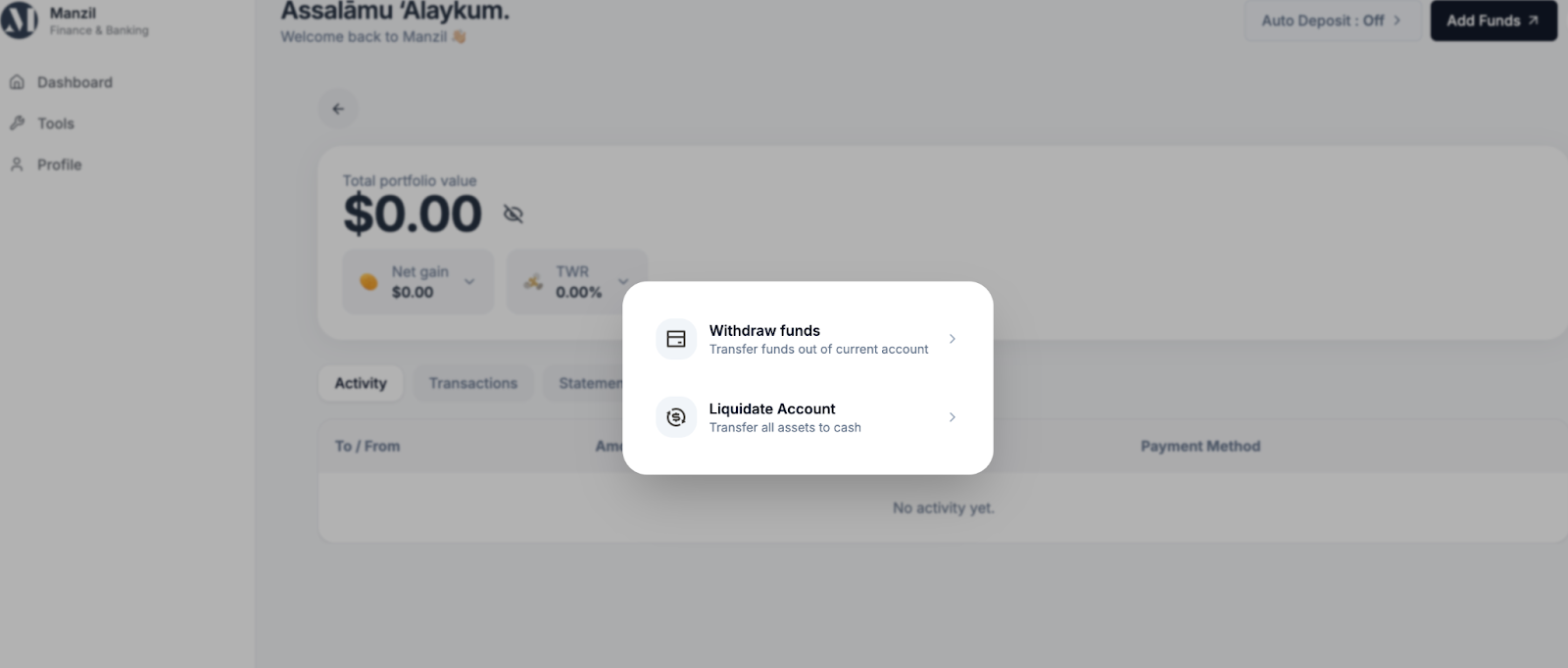- Click the Ellipsis Menu > select "Withdraw/ Liquidate account":